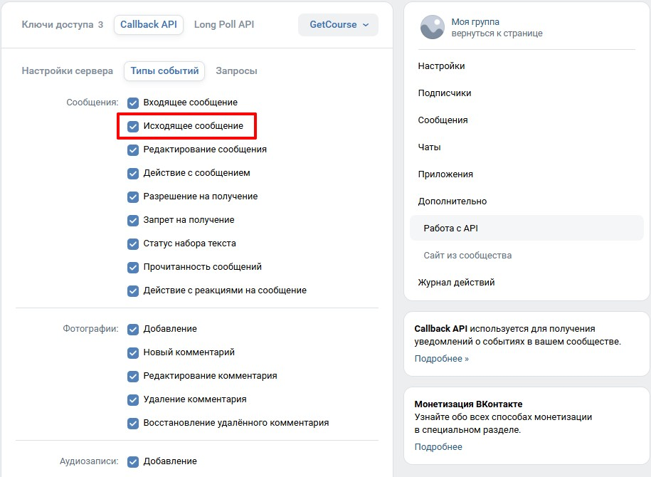 Также в сообществе может быть подключено несколько серверов, необходимо выбрать нужный и проверить наличие включенной опции "Исходящее сообщение".