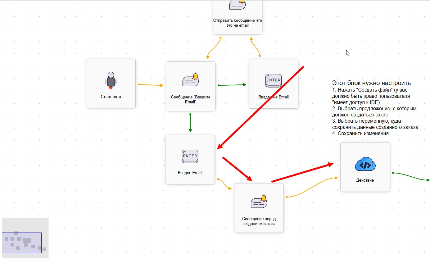 Заказ создается на почту, которую нужно указать в чате. Также в воронке обязательно нужно использовать ноду "Событие", в которой будет отслеживаться создание заказа: